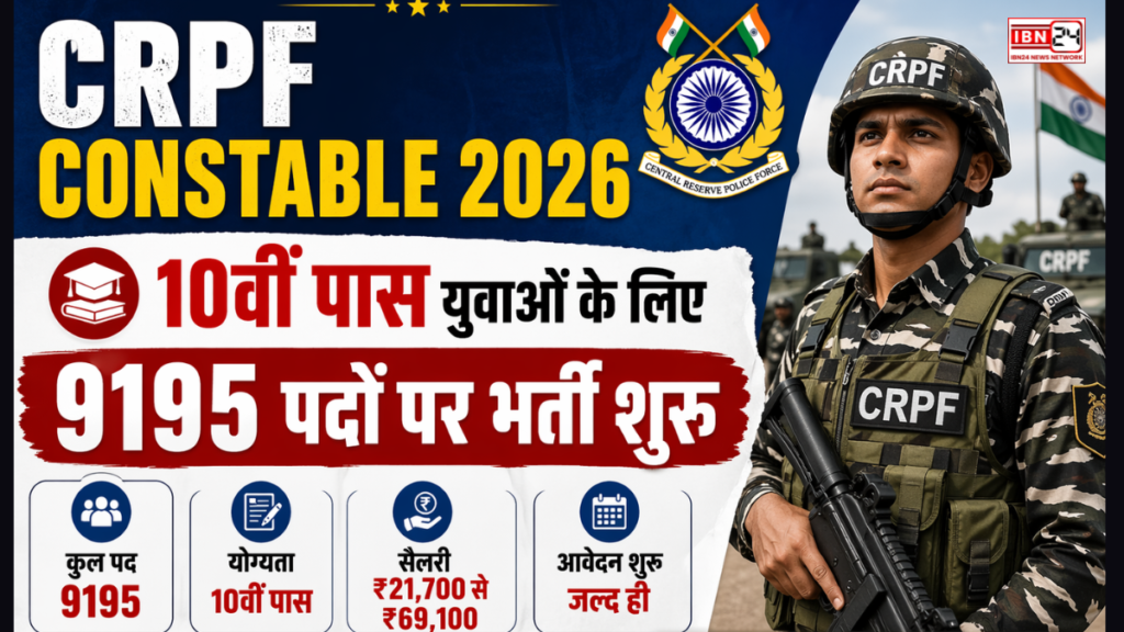 CRPF Constable 2026: 10वीं पास युवाओं के लिए, 9195 पदों पर भर्ती शुरू, जानें सैलरी और पूरी डिटेल! केंद्रीय रिजर्व पुलिस बल (CRPF) ने 2026 के लिए कांस्टेबल (तकनीकी एवं ट्रेड्समैन और पायनियर) के 9,195 पदों पर बंपर भर्ती की घोषणा की है। यह उन युवाओं के लिए एक शानदार अवसर है जिन्होंने 10वीं कक्षा पास कर ली है और देश सेवा का जज्बा रखते हैं। आवेदन प्रक्रिया 20 अप्रैल 2026 से शुरू हो चुकी है और 19 मई 2026 तक चलेगी। इच्छुक उम्मीदवार आधिकारिक वेबसाइट rect.crpf.gov.in के माध्यम से आवेदन कर सकते हैं ।