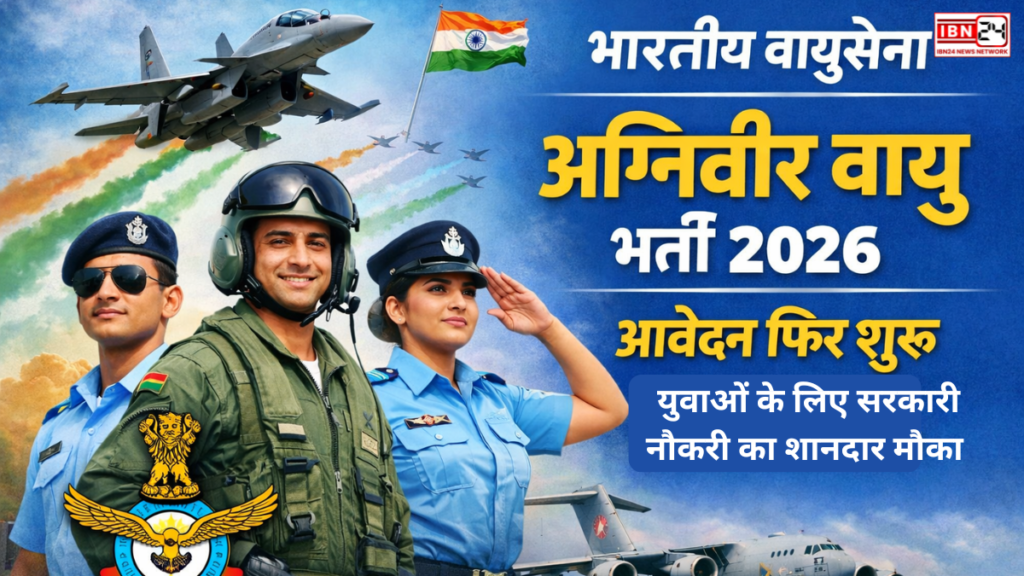 Indian Air Force Agniveer Vayu Recruitment 2026: आवेदन फिर शुरू, युवाओं के लिए सरकारी नौकरी का शानदार मौका! भारतीय वायुसेना (Indian Air Force – IAF) ने अग्निवीर वायु (Agniveer Vayu) इंटेक 01/2027 के लिए आवेदन प्रक्रिया को फिर से शुरू कर दिया है, जो देश के युवाओं के लिए वायुसेना में शामिल होने का एक और सुनहरा अवसर लेकर आया है। अग्निपथ योजना के तहत यह भर्ती अविवाहित पुरुष और महिला उम्मीदवारों को भारतीय वायुसेना में सेवा करने का मौका देती है। यह उन उम्मीदवारों के लिए विशेष रूप से महत्वपूर्ण है जो पहले आवेदन नहीं कर पाए थे या जिन्हें अपने आवेदन में सुधार करने की आवश्यकता थी।